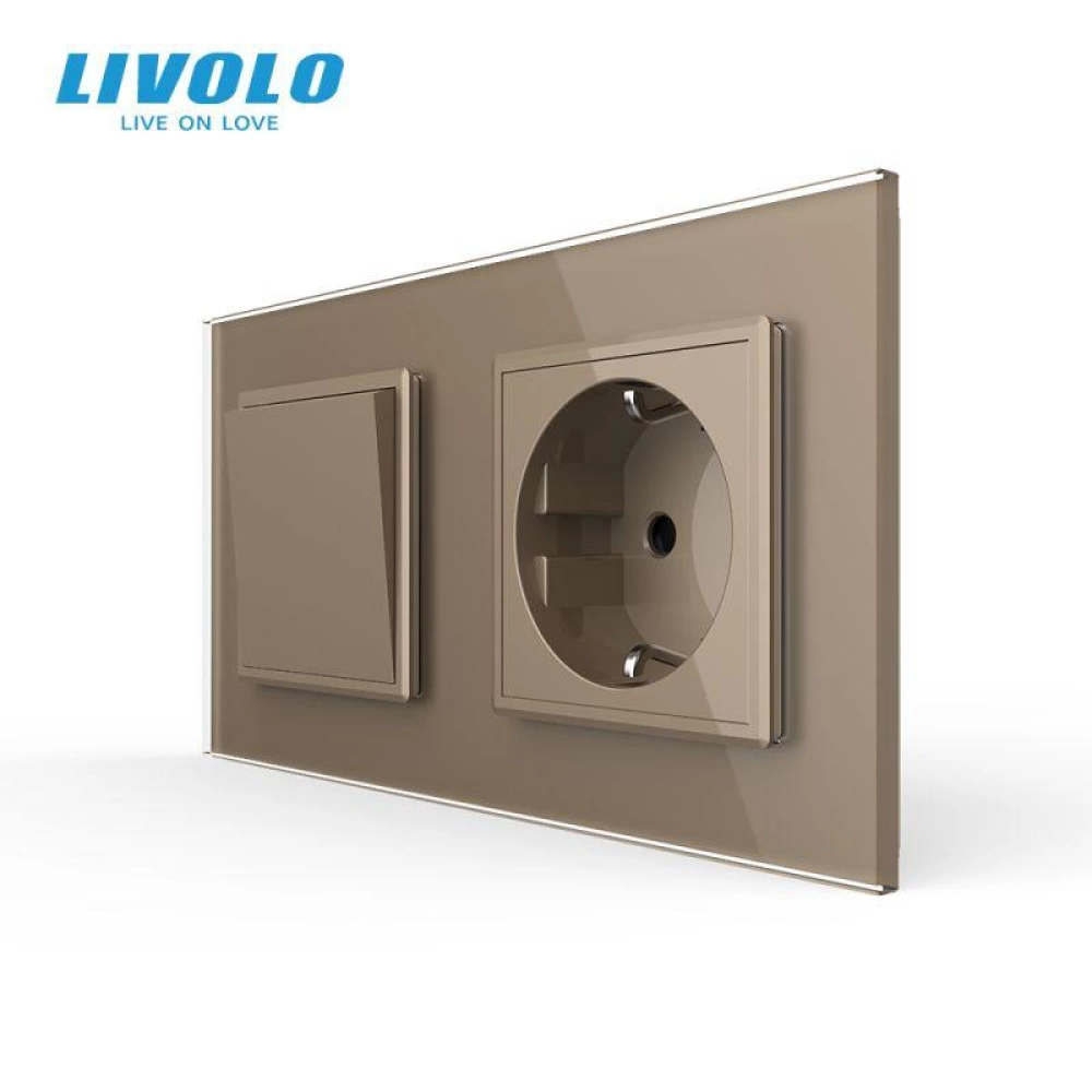 Intrerupator mecanic simplu + priza Schuko, cap / scara, cu rama sticla, Auriu, Livolo