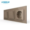 Intrerupator mecanic simplu + simplu + priza Schuko, cap / cruce, cu rama sticla, Auriu, Livolo