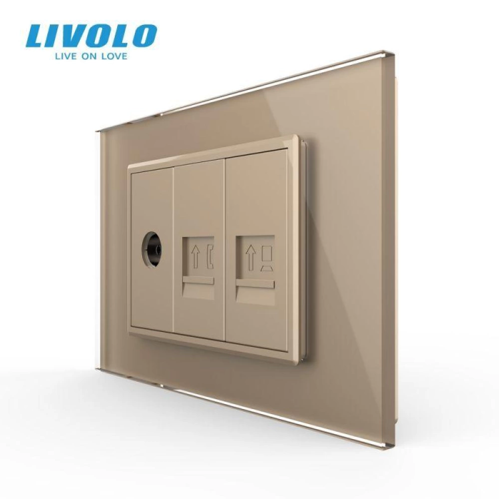 Priza TV + telefon + retea calculator 3M, TV+RJ11+RJ45, cu rama sticla, Auriu, Livolo