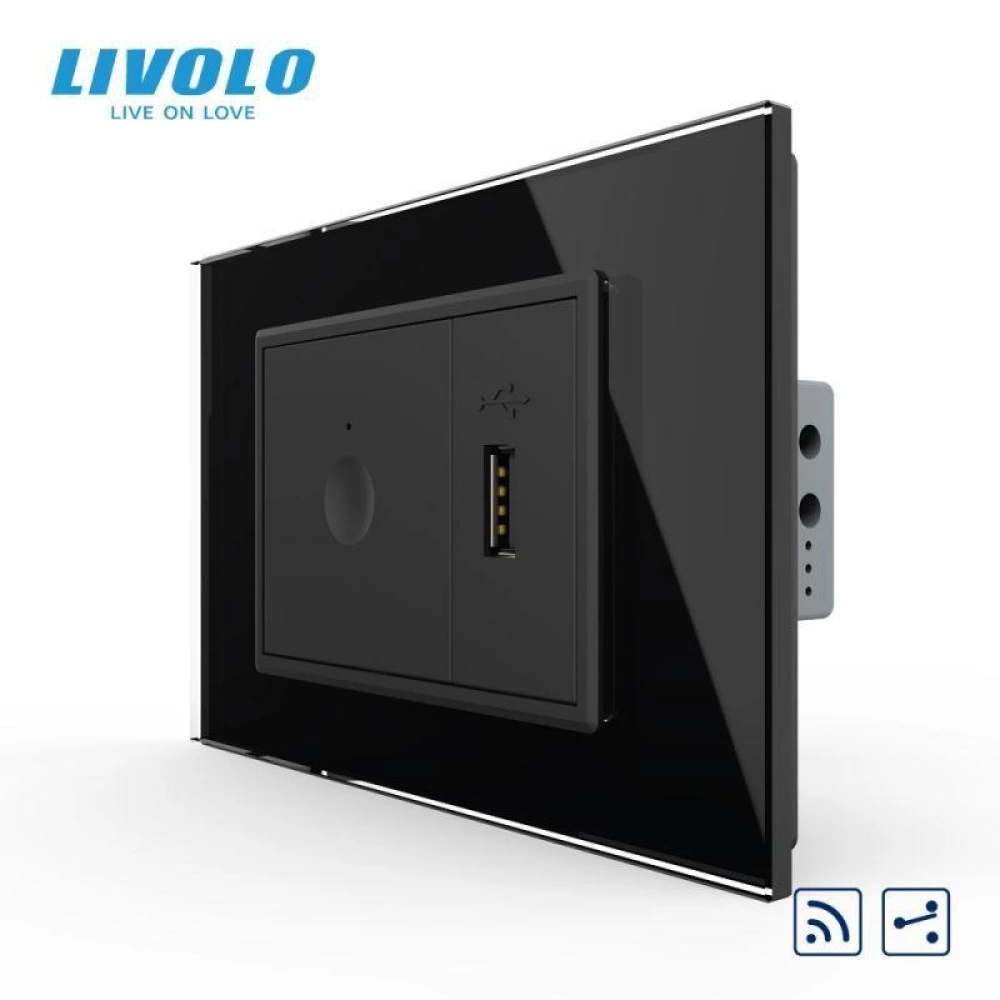 Intrerupator tactil simplu cap scara / cruce control telecomanda RF + priza USB, 3M, rama sticla, Negru, Livolo