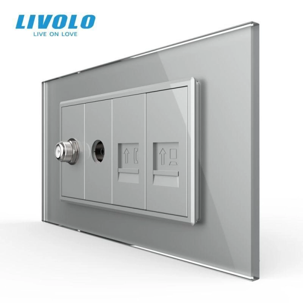 Priza TV Satelit, TV, Telefon, Retea calculator, 4M, cu rama sticla, Gri, Livolo