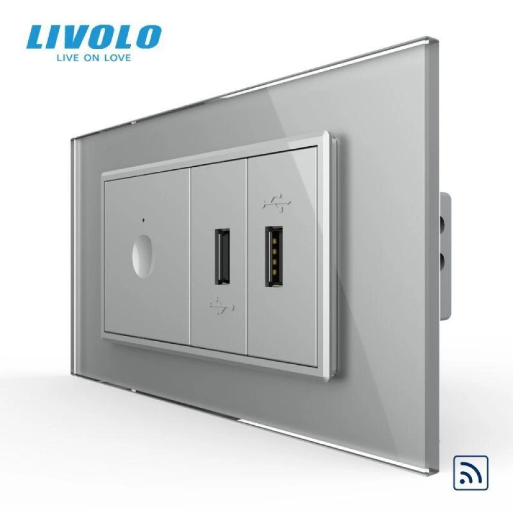 Intrerupator tactil simplu control telecomanda RF + priza dubla USB, 4M, cu rama sticla, Gri, Livolo